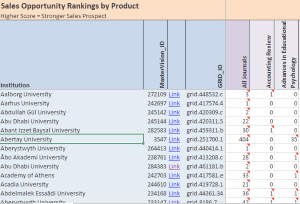 Scores are represented in a matrix, with institutions to target down the side and journals across the top. The higher the score for a particular journal, the stronger the sales opportunity.