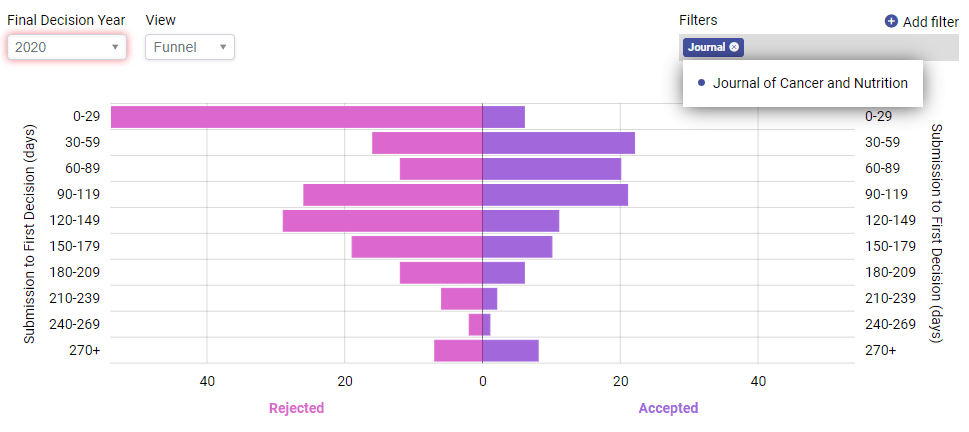 This is a breakdown of the number of accepted and rejected articles, according to the number of days taken to make a first decision on those articles. The funnel view provides a simple pictorial representation of the rate at which articles are dealt with.