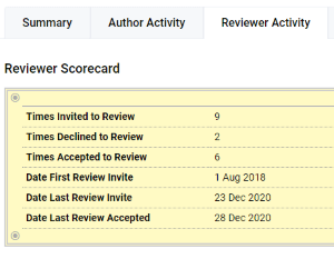 There might, of course, be simple reasons behind potentially problematic figures – perhaps the declined requests were all within a particular timeframe when the reviewer was unavailable, or the articles were all on the same subject that the reviewer felt was outside their area of expertise. To delve further into the data, you can simply scroll down for a full timeline of the reviewer’s activity, including article titles. And if it’s still important to approach an expert, even though their past performance hasn’t been ideal, then the scorecard will at least help with planning and expectation setting.