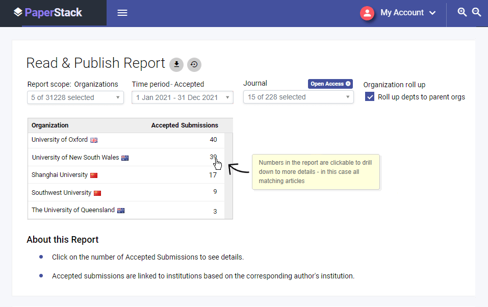 - Data may need to be rolled up: Author affiliations may be at a more specific level than that of the relevant Read+Publish deal. We can offer flexible support for rolling up to any level of the hierarchy, for example assigning accepted submissions from a department to the main university, or reporting at the consortia level. Publishers may wish to specify a particular set of institutions as Read+Publish participants and have submissions rolled up to that level.